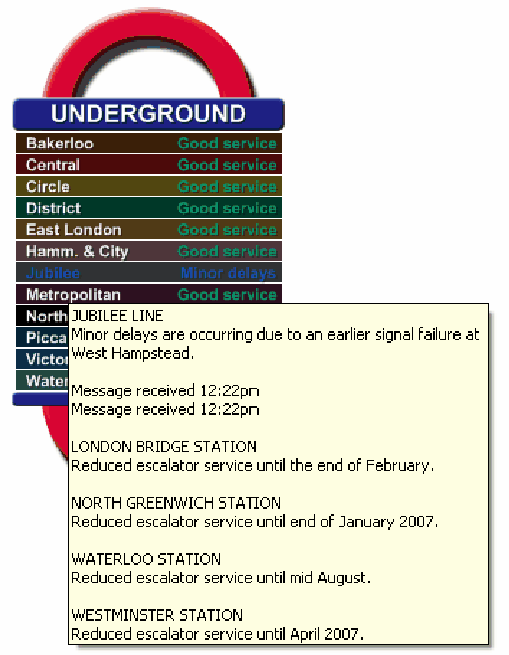 Si lo prefieres, configura London Underground Tube Status para ver sólo las líneas con problemas. Además, al situar el puntero del ratón sobre cada línea obtendrás información detallada sobre su estado y otros datos de interés, como por ejemplo, si funcionan las escaleras mecánicas.